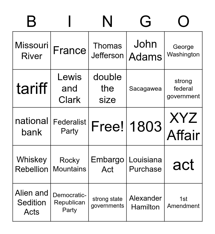This bingo card has a free space and 24 words: Rocky Mountains, Democratic-Republican Party, double the size, Alien and Sedition Acts, George Washington, Missouri River, tariff, France, 1803, Embargo Act, Sacagawea, national bank, Louisiana Purchase, act, Lewis and Clark, Alexander Hamilton, XYZ Affair, Thomas Jefferson, strong federal government, Federalist Party, 1st Amendment, Whiskey Rebellion, John Adams and strong state governments.