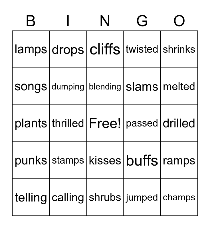 This bingo card has a free space and 45 words: swings, champs, fixes, telling, lasted, jumped, cliffs, wishes, shrinks, calling, twisted, passed, kisses, stamps, ants, shrubs, punches, plants, blocking, melted, drops, flosses, skills, lamps, shifted, drilled, plugs, falling, buffs, punks, winked, ramps, thanks, smelled, holding, thrilled, crunches, trusts, hunted, blending, songs, slams, presses, dumping and drafted.