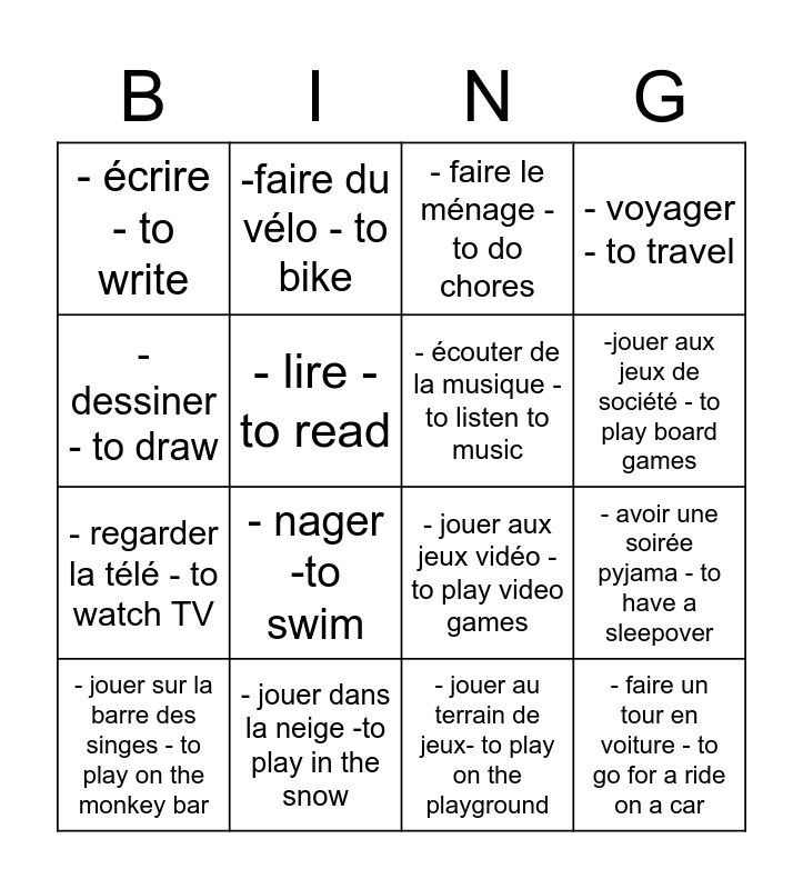 This bingo card has 24 words: Free!, -jouer aux cartes - to play cards, -jouer aux jeux de société - to play board games, - faire du ski - to ski, - dessiner - to draw, - écrire - to write, - lire - to read, -faire du vélo - to bike, - jouer dans la neige -to play in the snow, - faire de la luge - go tobogganing, - regarder la télé - to watch TV, - jouer aux jeux vidéo - to play video games, - cuisiner -to cook, -jouer de la musique-to play music, - écouter de la musique - to listen to music, - jouer au basketball - to play basketball, - jouer au terrain de jeux- to play on the playground, - faire le ménage - to do chores, - nager -to swim, - avoir une soirée pyjama - to have a sleepover, - jouer sur la barre des singes - to play on the monkey bar, - faire un tour en voiture - to go for a ride on a car, - voyager - to travel and - manger ensemble -to eat together.