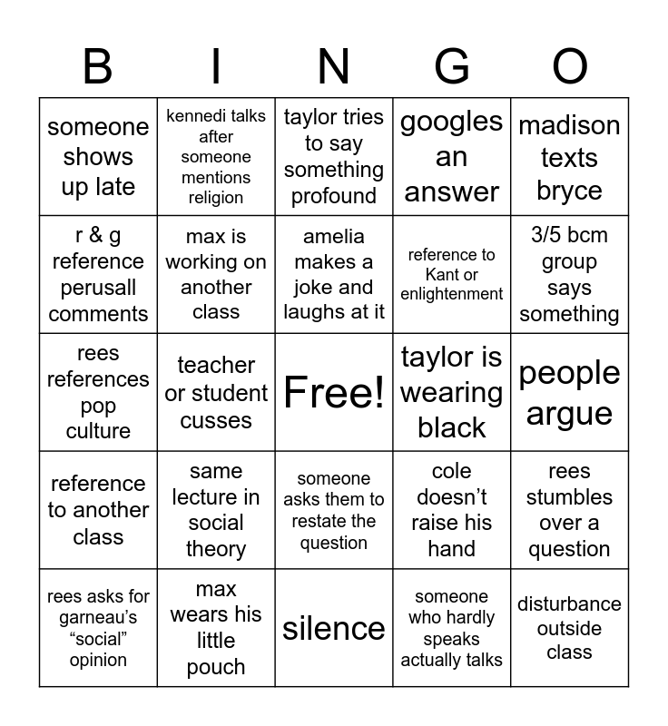 This bingo card has a free space and 24 words: same lecture in social theory, max wears his little pouch, amelia makes a joke and laughs at it, rees asks for garneau’s “social” opinion, madison texts bryce, someone shows up late, r & g reference perusall comments, kennedi talks after someone mentions religion, taylor is wearing black, someone asks them to restate the question, reference to Kant or enlightenment, rees references pop culture, cole doesn’t raise his hand, rees stumbles over a question, max is working on another class, someone who hardly speaks actually talks, people argue, taylor tries to say something profound, 3/5 bcm group says something, teacher or student cusses, disturbance outside class, reference to another class, googles an answer and silence.