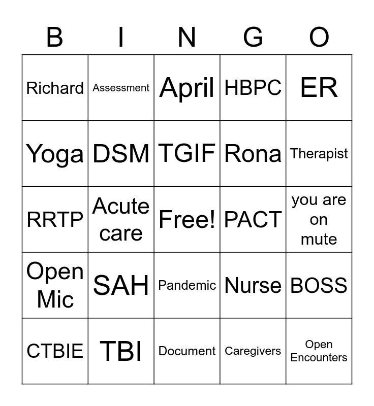 This bingo card has a free space and 69 words: CPRS, you are on mute, You Froze, VVC, TBI, Taco Tuesday, HBPC, CBOC, ER, CLC, BOSS, Beth, Richard, April, Melissa, Acute care, Pandemic, Rona, SCI, Open Mic, PACT, Nurse, Therapist, Case Management, Social Work, Advance Directive, Coping Skills, Veterans, Caregivers, Nursing home, Assessment, Triage note, Consults, Service connection, VBA, Food Pantry, CRISIS, Post 9/11, Yoga, Guided Meditation, SAH, Open Encounters, MSA, Doctor, Whole Health, CTBIE, Coffee, can you hear me, Can you see my screen, DSM, TGIF, Behavioral Health, More Coffee, Document, QI, Medication, Code Red, Living The Dream, Rapid Response, RRTP, HI-who just joined, Is this being recorded, I have to jump on another call, OOO, COVID Updates, MASKS, TEAM, Disability and HealthCare.