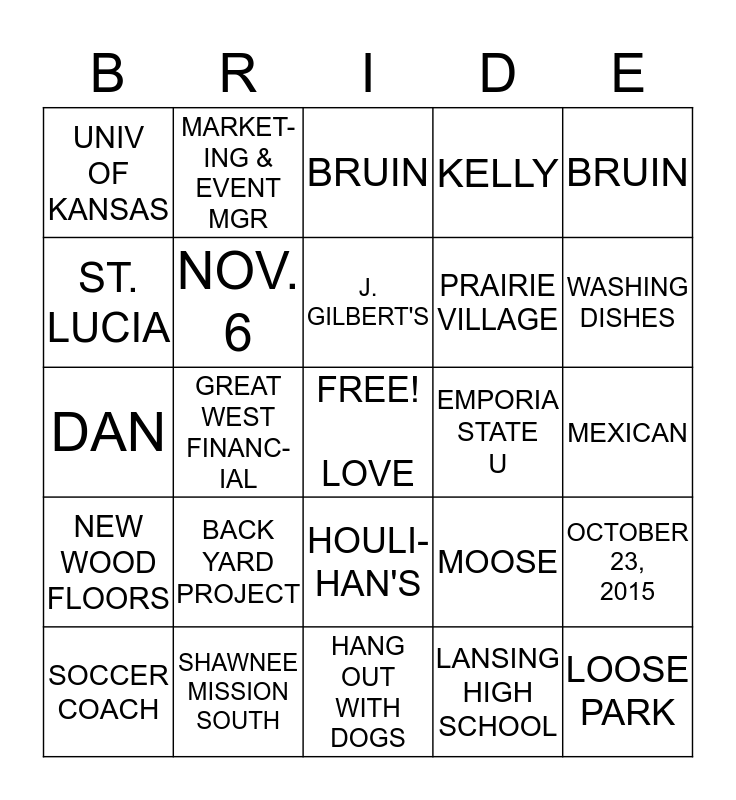 This bingo card has a free space and 28 words: OCTOBER 23, 2015, THE GUILD GARDEN, PRAIRIE VILLAGE, LANSING HIGH SCHOOL, ST. LUCIA, BRUIN, MARKET-ING & EVENT MGR, NEW WOOD FLOORS, EMPORIA STATE U, SOCCER COACH, DAN, KELLY, SHAWNEE MISSION SOUTH, HANG OUT WITH DOGS, WASHING DISHES, GOLD & NAVY, BACK YARD PROJECT, NOV. 6, J. GILBERT'S, HOULI- HAN'S, UNIV OF KANSAS, BLIND DATE BOWLING, LOOSE PARK, GREAT WEST FINANC- IAL, MEXICAN, MOOSE, BRUIN and NOV. 6.
