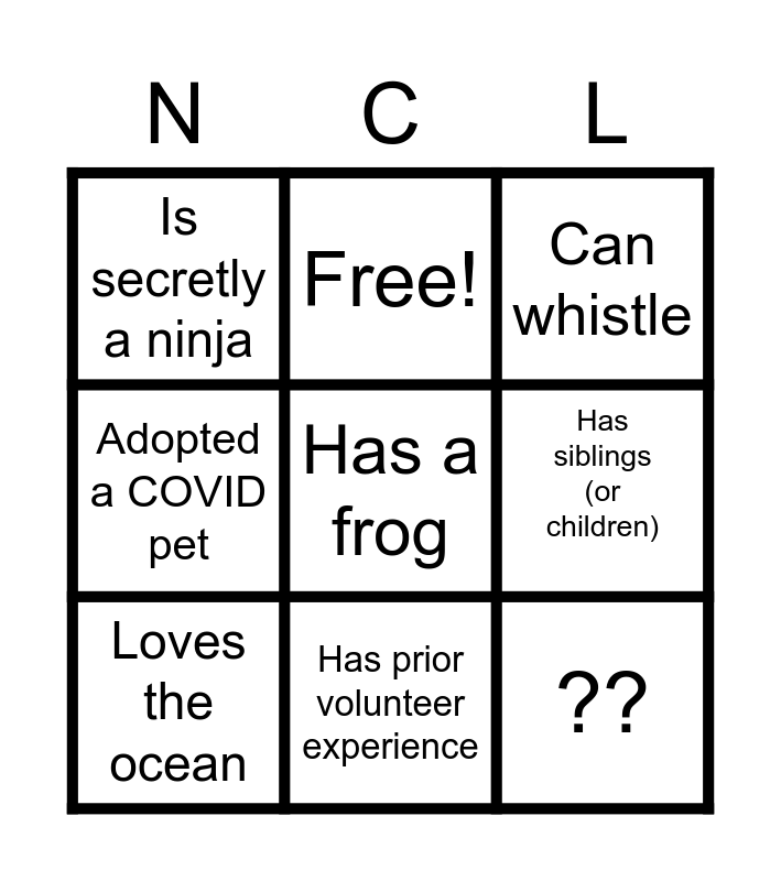 This bingo card has 12 words: Has travelled outside US, Has prior volunteer experience, ??, Adopted a COVID pet, Free!, Has siblings (or children), Loves the ocean, Born in March, Can whistle, Is secretly a ninja, Has a frog and Is left handed.