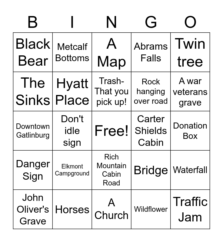 This bingo card has a free space and 24 words: Elkmont Campground, Horses, Trash-That you pick up!, John Oliver's Grave, Twin tree, Black Bear, The Sinks, Metcalf Bottoms, Carter Shields Cabin, Rich Mountain Cabin Road, Rock hanging over road, Downtown Gatlinburg, Bridge, Waterfall, Hyatt Place, Wildflower, Donation Box, A Map, A war veterans grave, Don't idle sign, Traffic Jam, Danger Sign, Abrams Falls and A Church.