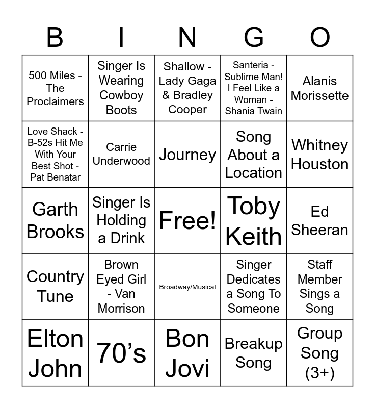 This bingo card has a free space and 81 words: Sweet Caroline - Neil Diamond, Tennessee Whiskey - Chris Stapleton, Shallow - Lady Gaga & Bradley Cooper, Friends In Low Places - Garth Brooks, Don’t Stop Believin’ - Journey, Dreams - Fleetwood Mac, What’s Up - 4 Non Blondes, Goodbye Earl - The Chicks, I Want It That Way - Backstreet Boys, Wagon Wheel - Darius Rucker, Zombie - The Cranberries, Jolene - Dolly Parton, Santeria - Sublime Man! I Feel Like a Woman - Shania Twain, 500 Miles - The Proclaimers, Dancing Queen - ABBA, Love Shack - B-52s Hit Me With Your Best Shot - Pat Benatar, Baby Got Back - Sir Mix-a-Lot, Brown Eyed Girl - Van Morrison, Sweet Child o’ Mine - Guns N’ Roses, Ed Sheeran, Adele, Alanis Morissette, Garth Brooks, Journey, Carrie Underwood, Brooks & Dunn, Queen Fleetwood Mac Johnny Cash, Elvis, Shania Twain, Dixie Chicks, Whitney Houston, Jimmy Buffet, Bon Jovi, Reba McIntire, Elton John, Toby Keith, Billy Joel, Pat Benatar, Singer is a Kid, Duet, Group Song (3+), Singer Has Glasses, Singer Has a Beard, Singer Has Visible Tattoos, Singer Is Holding a Drink, Singer Is Wearing a Hat, Singer Is Wearing Cowboy Boots, Singer Stops Singing/Gets Lost, Singer Ad-Libs/Changes Words, Singer Plays an Air Instrument, Singer Dedicates a Song To Someone, Staff Member Sings a Song, Reluctant Singer: Signed Up By a Friend, Crowd Politely Claps, Crowd Enthusiastically Claps, Crowd Sings Along, Someone Starts Dancing, Someone Whistles, Someone Says “I LOVE THIS SONG!” Someone Says “I hate this song!”, Disney, Broadway/Musical, Power Ballad, Boy Band, Hair Band, 50’s/60’s, One Hit Wonder, Rap Song, Classic Rock Song Alt Rock Song, Pop Song, Female Rocker, Punk Rock Hit, Country Tune, 70’s, 80’s, 90’s, 00’s, Love Song, Breakup Song, Party Anthem, Song About a Location and Song About Drinking.
