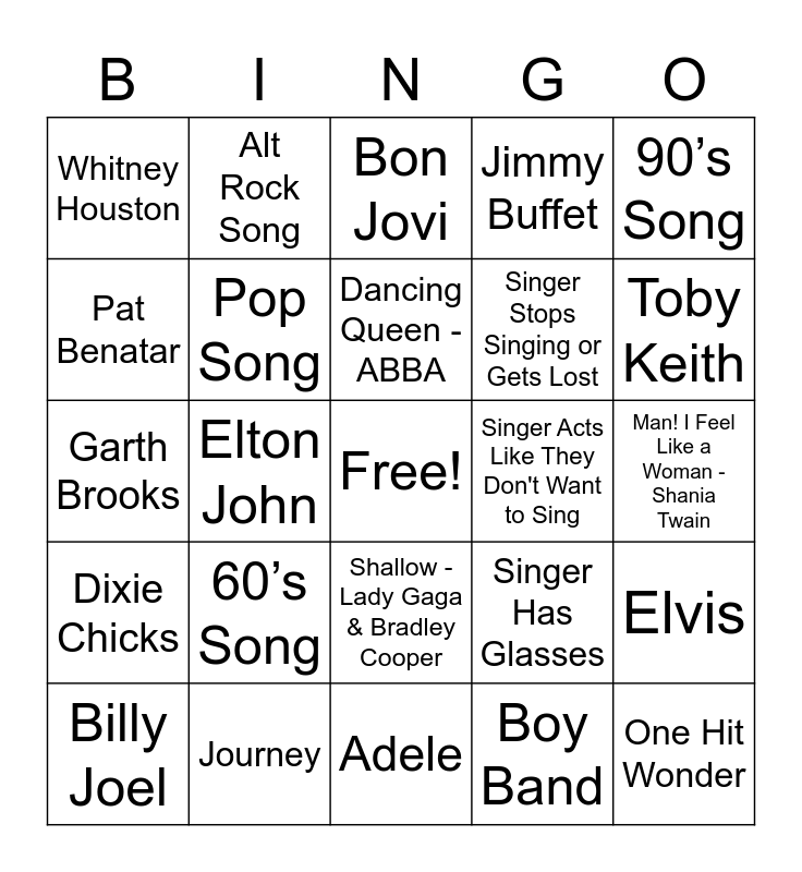 This bingo card has a free space and 90 words: Sweet Caroline - Neil Diamond, Tennessee Whiskey - Chris Stapleton, Shallow - Lady Gaga & Bradley Cooper, Friends In Low Places - Garth Brooks, Don’t Stop Believin’ - Journey, Dreams - Fleetwood Mac, What’s Up - 4 Non Blondes, Goodbye Earl - The Chicks, I Want It That Way - Backstreet Boys, Wagon Wheel - Darius Rucker, Zombie - The Cranberries, Jolene - Dolly Parton, Santeria - Sublime, Man! I Feel Like a Woman - Shania Twain, 500 Miles - The Proclaimers, Dancing Queen - ABBA, Love Shack - B-52s, Hit Me With Your Best Shot - Pat Benatar, Baby Got Back - Sir Mix-a-Lot, Brown Eyed Girl - Van Morrison, Sweet Child o’ Mine - Guns N’ Roses, Ed Sheeran, Adele, Alanis Morissette, Garth Brooks, Journey, Carrie Underwood, Brooks & Dunn, Queen, Fleetwood Mac, Johnny Cash, Elvis, Shania Twain, Dixie Chicks, Whitney Houston, Jimmy Buffet, Bon Jovi, Reba McIntire, Elton John, Toby Keith, Billy Joel, Pat Benatar, Singer is a Kid, Duet, Group Song (3+), Singer Has Glasses, Singer Has a Beard, Singer Has Visible Tattoos, Singer Is Holding a Drink, Singer Is Wearing a Hat, Singer Is Wearing Cowboy Boots, Singer Stops Singing or Gets Lost, Singer Ad-Libs or Changes Words, Singer Plays an Air Instrument, Singer Dedicates a Song To Someone, Staff Member Sings a Song, Singer Acts Like They Don't Want to Sing, Crowd Politely Claps, Crowd Enthusiastically Claps, Crowd Sings Along, Someone Starts Dancing, Someone Whistles, Someone Says “I LOVE THIS SONG!”, Someone Says “I hate this song!”, Disney, Broadway or Musical Song, Power Ballad, Boy Band, Hair Band, 50’s Song, 60’s Song, One Hit Wonder, Rap Song, Classic Rock Song, Alt Rock Song, Pop Song, Female Rocker, Punk Rock Hit, Country Tune, 70’s Song, 80’s Song, 90’s Song, 00’s Song, 2010's Song, 2020's Song, Love Song, Breakup Song, Party Anthem, Song About a Location and Song About Drinking.