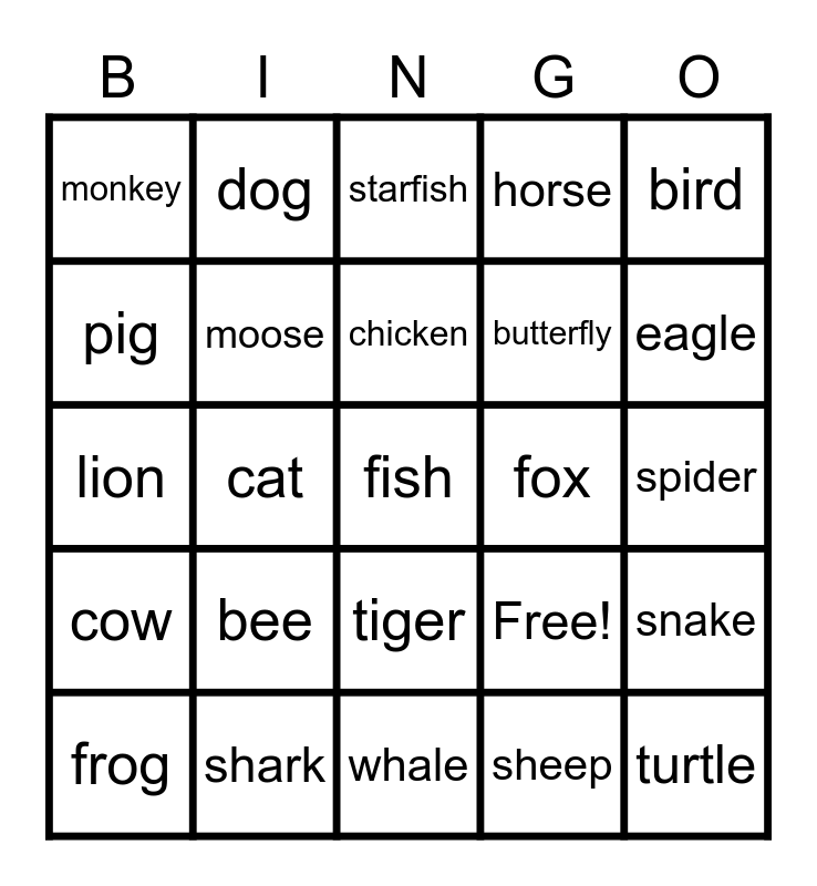 This bingo card has 25 words: bee, whale, chicken, frog, bird, monkey, pig, dog, fox, tiger, butterfly, lion, Free!, snake, moose, turtle, spider, starfish, eagle, cat, fish, shark, cow, horse and sheep.