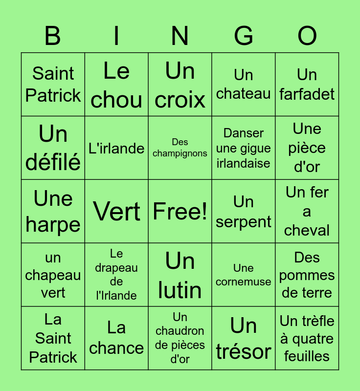 This bingo card has a free space and 29 words: La Saint Patrick, Le 17 mars, Vert, Un trèfle, Saint Patrick, Un croix, L'irlande, Le drapeau de l'Irlande, Un serpent, La chance, Un fer a cheval, Un trèfle à quatre feuilles, Un chaudron de pièces d'or, Un trésor, Une pièce d'or, Un arc-en-ciel, Un lutin, un chapeau vert, Un farfadet, Une harpe, Une cornemuse, Un violon, Danser une gigue irlandaise, Un défilé, Un chateau, Le chou, Des pommes de terre, Des champignons and Une parade.