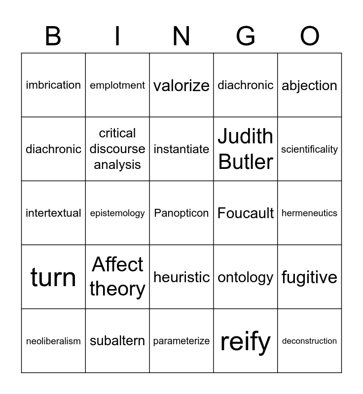 This bingo card has a free space and 24 words: Affect theory, subaltern, instantiate, neoliberalism, abjection, imbrication, diachronic, emplotment, Foucault, heuristic, Judith Butler, intertextual, ontology, fugitive, critical discourse analysis, reify, hermeneutics, valorize, scientificality, epistemology, deconstruction, turn, diachronic and parameterize.