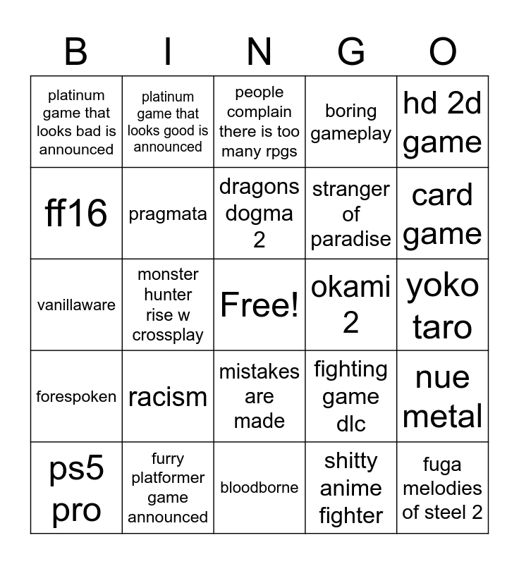 This bingo card has a free space and 24 words: racism, furry platformer game announced, dragons dogma 2, ps5 pro, hd 2d game, platinum game that looks bad is announced, ff16, platinum game that looks good is announced, okami 2, mistakes are made, stranger of paradise, vanillaware, fighting game dlc, nue metal, pragmata, shitty anime fighter, yoko taro, people complain there is too many rpgs, card game, monster hunter rise w crossplay, fuga melodies of steel 2, forespoken, boring gameplay and bloodborne.