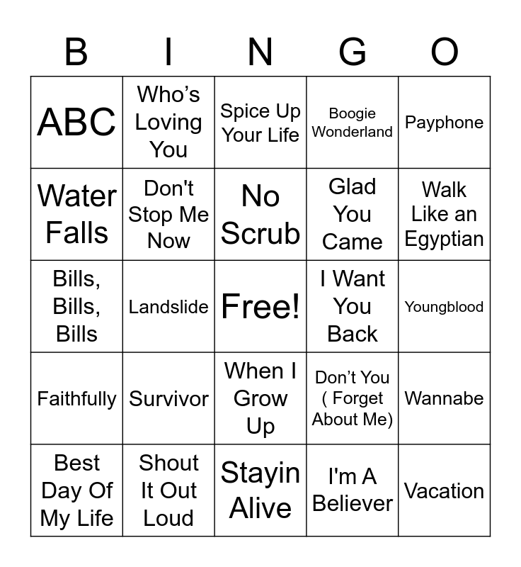 This bingo card has a free space and 74 words: You Get What You Give, MMMBop, Spice Up Your Life, C’est La Vie, EveryBody ( Backstreet’s Back ), Wake Me Up Before You Go-Go, Who Let The Dogs Out, Stop! In The Name Of Love, Best Day Of My Life, December, 1963 ( Oh What A Night), Build Me Up Buttercup, Land Of A Thousand Dances, No Scrub, Water Falls, Tearin’ Up My Heart - Radio Edit, Landslide, We Got The BEat, Walk Like an Egyptian, Every Breath You Take, Bills, Bills, Bills, Don't Stop Me Now, Who’s Loving You, Boogie Wonderland, Whatta MAn, Vacation, We Are Family, Blame It On the Boogie, Knockin’ On Heaven’s Door, Poison, Red Red Wine, Payphone, Get Down On It, What Makes You Beautiful, Hey Ya!, Rock And Roll All Nite, I'm A Believer, It’s Tricky, Sucker, Wouldn’t It Be Nice, Any Way You Want it, Stayin Alive, Shout It Out Loud, Love Grows ( Where My Rosemary Goes), Let’s Groove, More Than A Woman, ABC, Karma Chameleon, Survivor, Can You Stand The Rain, What A Man Gotta Do, Hey Jude, End Of The Road, Youngblood, Wings, The Tide Is High, You Can’t Hurry Love, When I Grow Up, I'm So Excited, Chapel Of Love, Wannabe, Glad You Came, Step By Step, Faithfully, Y.M.C.A, I Want You Back, I’m Gonna Be (500 Miles), Cruel Summer, My Lovin’ (You’re Never Gonna Get It ), Don’t You ( Forget About Me), Stayc’s Mom, Take on Me, Counting Stars, All Star and I Want It That Way.