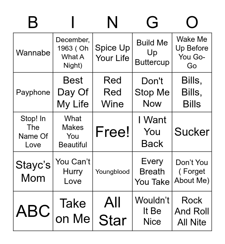 This bingo card has a free space and 75 words: You Get What You Give, MMMBop, Spice Up Your Life, C’est La Vie, Who’s Loving You, Boogie Wonderland, Whatta MAn, Vacation, We Are Family, Blame It On the Boogie, Knockin’ On Heaven’s Door, Poison, Red Red Wine, Payphone, Get Down On It, What Makes You Beautiful, Hey Ya!, Rock And Roll All Nite, EveryBody ( Backstreet’s Back ), Wake Me Up Before You Go-Go, Who Let The Dogs Out, Stop! In The Name Of Love, Best Day Of My Life, December, 1963 ( Oh What A Night), Build Me Up Buttercup, Land Of A Thousand Dances, Little Bitty Pretty One, No Scrub, WaterFalls, Tearin’ Up My Heart - Radio Edit, Landslide, We Got The Beat, Walk Like an Egyptian, Every Breath You Take, Bills, Bills, Bills, Don't Stop Me Now, I'm A Believer, It’s Tricky, Sucker, Wouldn’t It Be Nice, Any Way You Want it, Stayin Alive, Shout It Out Loud, Love Grows ( Where My Rosemary Goes), Let’s Groove, More Than A Woman, ABC, Wannabe, What A Man Gotta Do, Hey Jude, End Of The Road, Youngblood, Wings, Karma Chameleon, Survivor, Can You Stand The Rain, When I Grow Up, I'm So Excited, Chapel Of Love, The Tide Is High, You Can’t Hurry Love, Glad You Came, Step By Step, Faithfully, Y.M.C.A, I Want You Back, I’m Gonna Be (500 Miles), Cruel Summer, My Lovin’ (You’re Never Gonna Get It ), Don’t You ( Forget About Me), Stayc’s Mom, Take on Me, Counting Stars, All Star and I Want It That Way.