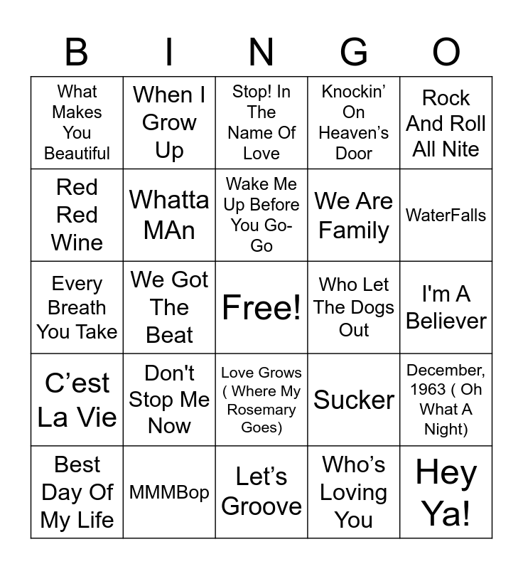 This bingo card has a free space and 61 words: You Get What You Give, MMMBop, Spice Up Your Life, C’est La Vie, Who’s Loving You, Boogie Wonderland, Whatta MAn, Vacation, We Are Family, Blame It On the Boogie, Knockin’ On Heaven’s Door, Poison, Red Red Wine, Payphone, Get Down On It, What Makes You Beautiful, Hey Ya!, Rock And Roll All Nite, EveryBody ( Backstreet’s Back ), Wake Me Up Before You Go-Go, Who Let The Dogs Out, Stop! In The Name Of Love, Best Day Of My Life, December, 1963 ( Oh What A Night), Build Me Up Buttercup, Land Of A Thousand Dances, Little Bitty Pretty One, No Scrub, WaterFalls, Tearin’ Up My Heart - Radio Edit, Landslide, Karma Chameleon, Survivor, Can You Stand The Rain, When I Grow Up, I'm So Excited, Chapel Of Love, We Got The Beat, Walk Like an Egyptian, Every Breath You Take, Bills, Bills, Bills, Don't Stop Me Now, I'm A Believer, It’s Tricky, Sucker, Wouldn’t It Be Nice, Any Way You Want it, Stayin Alive, Shout It Out Loud, Love Grows ( Where My Rosemary Goes), Let’s Groove, More Than A Woman, ABC, Wannabe, What A Man Gotta Do, Hey Jude, End Of The Road, Youngblood, Wings, All Star and I Want It That Way.
