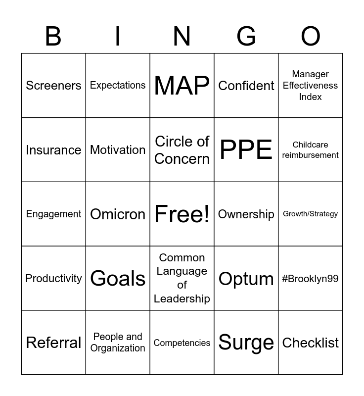 This bingo card has a free space and 50 words: Onboarding, Checklist, Workflow, Competencies, Goals, Access, Expectations, Training, Insurance, Certificate, Motivation, Confident, #Brooklyn99, Optum, Circle of Control, Circle of Influence, Circle of Concern, Ownership, Employee Experience Index, Manager Effectiveness Index, Omicron, Surge, Screeners, PPE, Plexiglas, Health and Safety, Childcare reimbursement, Fix the Ladder, MAP, Common Language of Leadership, What, How, X-Matrix, SMART, People and Organization, Population Health, Patient Experience, Affordability, Operational Efficiency, Growth/Strategy, Exceeds Expectations, Burke, Development, Improvement, Referral, Engagement, NPS, Task, Productivity and MW500.