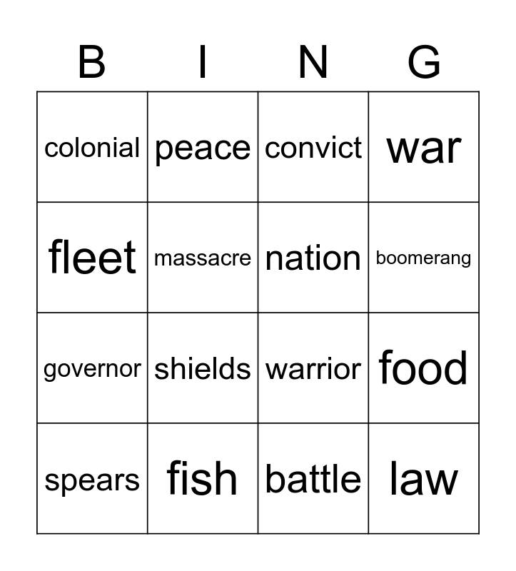 This bingo card has 16 words: fish, food, convict, colonial, governor, peace, warrior, battle, fleet, massacre, spears, war, shields, boomerang, nation and law.