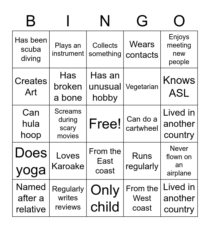 This bingo card has a free space and 34 words: Been to Disney this year, From the West coast, Comes from a big family, Creates art, Does yoga, Has broken a bone, Enjoys meeting new people, Named after a relative, Plays an instrument, On a sports team/league, Has an unusual hobby, Collects something, Midwestern, Met a celebrity, Can do a cartwheel, Knows ASL, Regularly writes reviews, Can hula hoop, Loves Karoake, Runs regularly, From the East coast, Works out regularly, Has been scuba diving, Lived in another country, Only child, Lived in another country, Wears contacts, Is left-handed, Vegetarian, Creates Art, Rides horses, Screams during scary movies, Never flown on an airplane and Has food allergies.