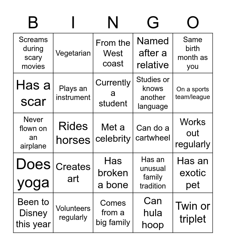 This bingo card has 35 words: Can whistle, Enjoys meeting new people, Has a cat, Plays an instrument, Has broken a bone, Named after a relative, Has a scar, Has food allergies, Currently a student, Collects something, Never flown on an airplane, Same birth month as you, Free!, Loves Karoake, Screams during scary movies, Can do a cartwheel, Can hula hoop, Rides horses, Does yoga, Met a celebrity, Has an unusual family tradition, Been to Disney this year, Has an exotic pet, Volunteers regularly, From the West coast, On a sports team/league, Twin or triplet, Has an unusual hobby, Studies or knows another language, Works out regularly, Midwestern, Comes from a big family, Creates art, Vegetarian and Has been scuba diving.