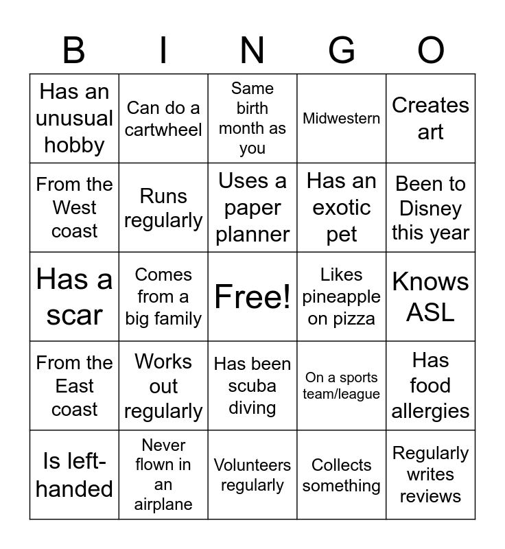 This bingo card has a free space and 39 words: Only child, Lived in another country, Wears contacts, Runs regularly, Is left-handed, Has been scuba diving, Uses a paper planner, Vegetarian, Creates art, From the East coast, Comes from a big family, Midwestern, Regularly writes reviews, Knows ASL, Likes pineapple on pizza, Works out regularly, Studies or knows another language, Has an unusual hobby, Twin or triplet, On a sports team/league, From the West coast, Volunteers regularly, Has an exotic pet, Been to Disney this year, Has an unusual family tradition, Met a celebrity, Does yoga, Rides horses, Can hula hoop, Can do a cartwheel, Screams during scary movies, Loves Karoake, Same birth month as you, Never flown in an airplane, Collects something, Currently a student, Has food allergies, Has a scar and Named after a relative.