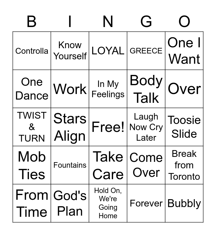 This bingo card has a free space and 53 words: 0 to 100/ The Catch Up, Bubbly, Can't Take A Joke, Forever, Fountains, Jumpman, Know Yourself, Way 2 Sexy, One Dance, Started From the Bottom, Work, 38, Break from Toronto, Come Over, F**kin' Problems, From Time, In My Feelings, Laugh Now Cry Later, Nice For What, One I Want, Stars Align, All Mine, Body Talk, Controlla, Fake Love, God's Plan, Hotline Bling, Live Up to My Name, The Motto, Over, Signs, Too Good, Back To Back, Body, Crew Love, EYE ON IT, GREECE, Hold On, We're Going Home, LOYAL, Mood, Over The Top, Run Up, Toosie Slide, BELIEVE IT, Best I Ever Had, Take Care, Drama, Gyalchester, TWIST & TURN, Mob Ties, Passionfruit, POPSTAR and Truffle Butter.