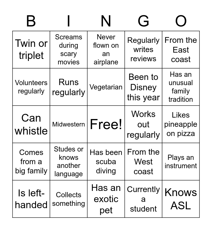 This bingo card has a free space and 39 words: Only child, Lived in another country, Wears contacts, Runs regularly, Is left-handed, Has been scuba diving, Vegetarian, Creates art, From the East coast, Comes from a big family, Midwestern, Regularly writes reviews, Knows ASL, Likes pineapple on pizza, Works out regularly, Studes or knows another language, Has an unusual hobby, Twin or triplet, On a sports team/league, From the West coast, Volunteers regularly, Has an exotic pet, Been to Disney this year, Has an unusual family tradition, Met a celebrity, Does yoga, Rides horses, Can hula hoop, Can do a cartwheel, Screams during scary movies, Loves Karoake, Same birth month as you, Never flown on an airplane, Collects something, Currently a student, Has food allergies, Plays an instrument, Can whistle and Enjoys meeting new people.