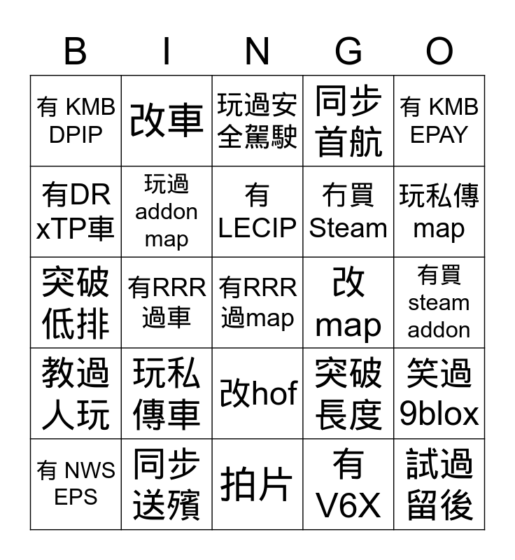 This bingo card has 25 words: 玩私傳車, 拍片, 有LECIP, 有 NWS EPS, 有 KMB EPAY, 有 KMB DPIP, 有DR xTP車, 改車, 改map, 改hof, 冇買Steam, 突破低排, 突破長度, 笑過9blox, 玩過 addon map, 試過留後, 有買 steam addon, 玩過安全駕駛, 玩私傳map, 有RRR過車, 有RRR過map, 同步送殯, 教過人玩, 同步首航 and 有V6X.