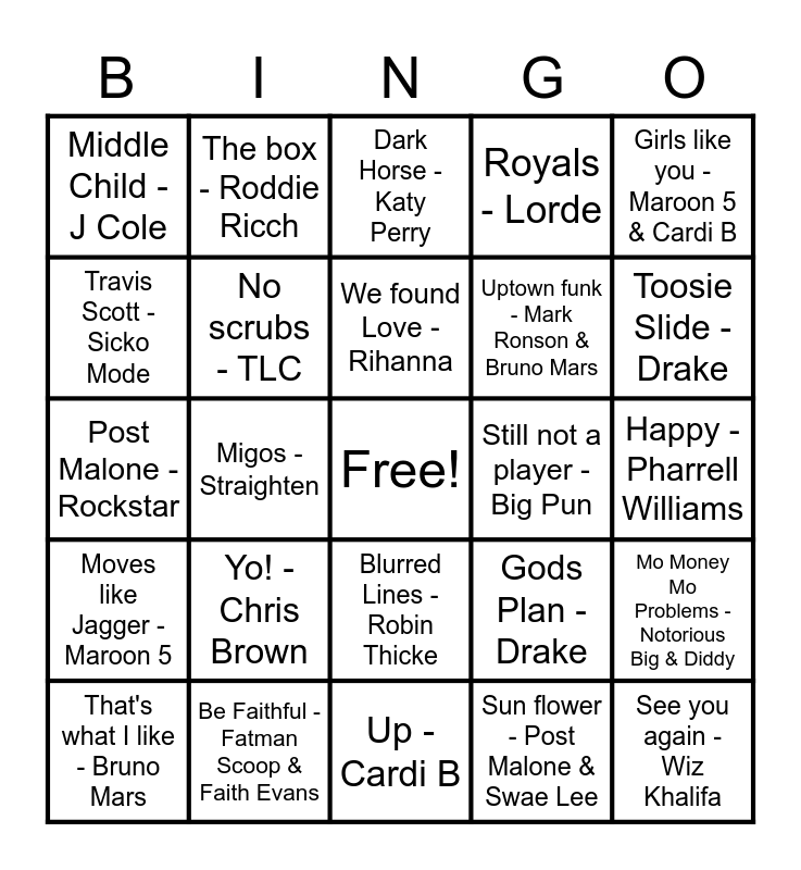 This bingo card has a free space and 24 words: That's what I like - Bruno Mars, Yo! - Chris Brown, We found Love - Rihanna, Sun flower - Post Malone & Swae Lee, Girls like you - Maroon 5 & Cardi B, Middle Child - J Cole, The box - Roddie Ricch, Dark Horse - Katy Perry, Still not a player - Big Pun, Happy - Pharrell Williams, Post Malone - Rockstar, No scrubs - TLC, Gods Plan - Drake, Mo Money Mo Problems - Notorious Big & Diddy, Travis Scott - Sicko Mode, Be Faithful - Fatman Scoop & Faith Evans, Up - Cardi B, Royals - Lorde, Toosie Slide - Drake, Moves like Jagger - Maroon 5, Migos - Straighten, Blurred Lines - Robin Thicke, Uptown funk - Mark Ronson & Bruno Mars and See you again - Wiz Khalifa.