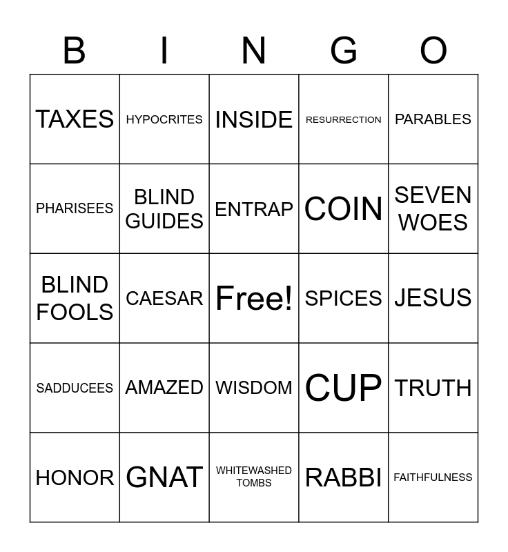 This bingo card has a free space and 63 words: EXALT, HUMBLE, PRIDE, TRUTH, HEARTS, HYPOCRISY, HYPOCRITES, QUESTIONS, ENTRAP, INFINITE, WISDOM, RELIGIOUS LEADERS, JESUS, PARABLES, TEACHER, PHARISEES, CAESAR, TAXES, DENARIUS, COIN, AMAZED, SADDUCEES, RESURRECTION, ASTONISHED, ABRAHAM, ISAAC, JACOB, COMMANDMENTS, SOUL, MIND, NEIGHBOR, YOURSELF, SON OF DAVID, LORD, SEVEN WOES, HONOR, GREETED, RABBI, SERVANT, BLIND GUIDES, BLIND FOOLS, SPICES, JUSTICE, MERCY, FAITHFULNESS, GNAT, CAMEL, CUP, DISH, GREED, SELF–INDULGENCE, WHITEWASHED TOMBS, DEAD MAN’S BONES, RIGHTEOUS, OUTSIDE, INSIDE, MURDERED THE PROPHETS, SNAKES, VIPERS, JERUSALEM, HEN, CHICKS and WINGS.