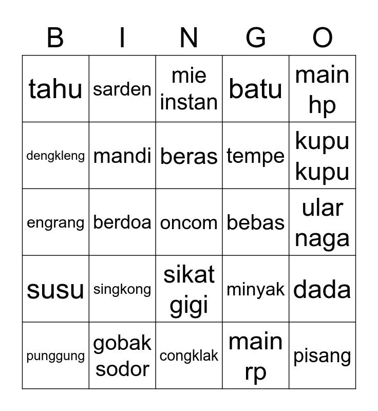 This bingo card has 25 words: singkong, congklak, beras, punggung, main hp, tahu, dengkleng, sarden, bebas, sikat gigi, tempe, engrang, minyak, dada, mandi, pisang, ular naga, mie instan, kupu kupu, berdoa, oncom, gobak sodor, susu, batu and main rp.