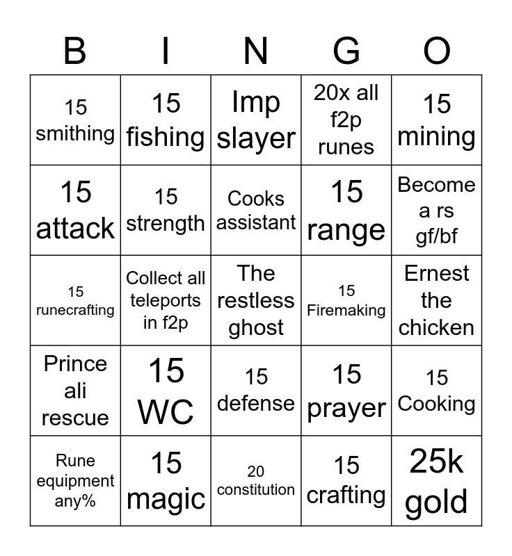 This bingo card has a free space and 24 words: 15 WC, 15 magic, Cooks assistant, Rune equipment any%, 15 mining, 15 smithing, 15 attack, 15 fishing, 15 Firemaking, 15 defense, 15 range, 15 runecrafting, 15 prayer, 15 Cooking, 15 strength, 15 crafting, Ernest the chicken, Imp slayer, Become a rs gf/bf, Collect all teleports in f2p, 25k gold, Prince ali rescue, 20x all f2p runes and 20 constitution.