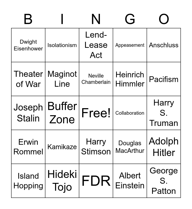 This bingo card has a free space and 27 words: Douglas MacArthur, Blitzkrieg, Heinrich Himmler, FDR, Theater of War, Lend-Lease Act, Isolationism, Erwin Rommel, Collaboration, Adolph Hitler, Joseph Stalin, Appeasement, Island Hopping, Hideki Tojo, Pacifism, Robert Oppenheimer, Maginot Line, Neville Chamberlain, Kamikaze, Dwight Eisenhower, Harry S. Truman, Albert Einstein, Buffer Zone, George S. Patton, Harry Stimson, Anschluss and Emperor Hirohoto.