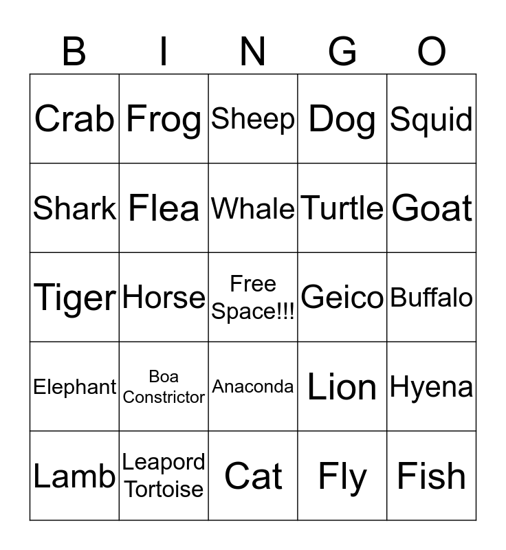 This bingo card has a free space and 24 words: Boa Constrictor, Leapord Tortoise, Whale, Lamb, Squid, Crab, Shark, Frog, Geico, Anaconda, Turtle, Tiger, Lion, Hyena, Flea, Fly, Buffalo, Sheep, Goat, Horse, Fish, Elephant, Dog and Cat.