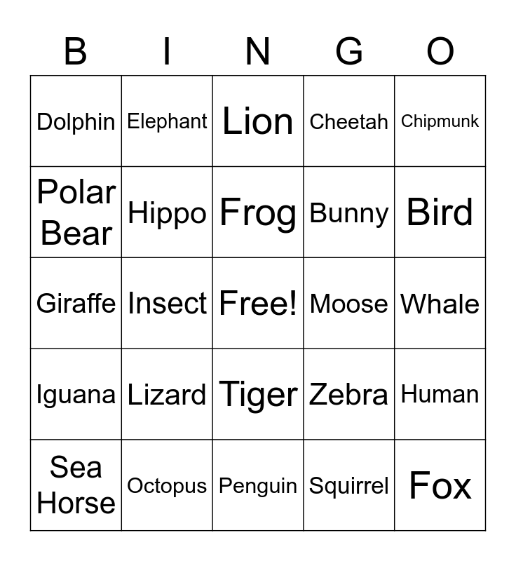 This bingo card has a free space and 24 words: Lizard, Octopus, Frog, Sea Horse, Chipmunk, Dolphin, Polar Bear, Elephant, Moose, Tiger, Bunny, Giraffe, Zebra, Human, Hippo, Squirrel, Whale, Lion, Bird, Insect, Fox, Iguana, Cheetah and Penguin.