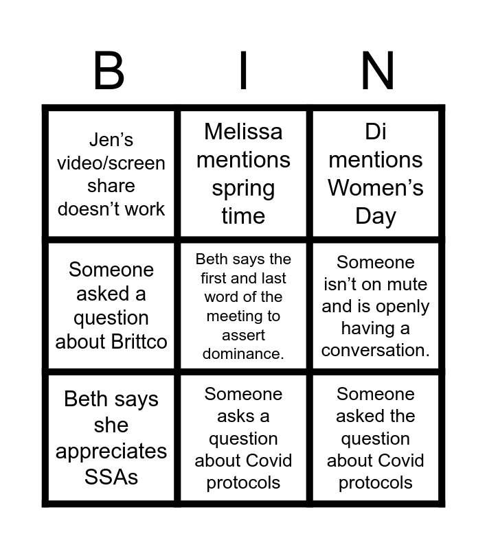 This bingo card has 10 words: Someone asks a question about Covid protocols, Di mentions Women’s Day, Jen’s video/screen share doesn’t work, Beth says the first and last word of the meeting to assert dominance., Someone asked a question about Brittco, Beth says she appreciates SSAs, Melissa mentions spring time, At least 1 SSA appears to be sleeping, Someone isn’t on mute and is openly having a conversation. and Someone asked the question about Covid protocols.