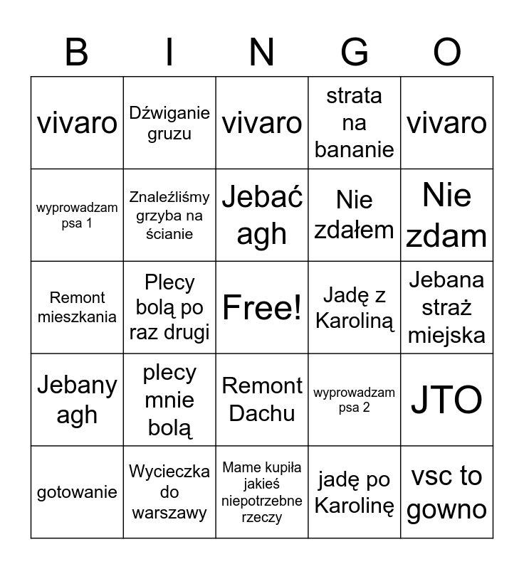 This bingo card has a free space and 24 words: plecy mnie bolą, Wycieczka do warszawy, Jebać agh, gotowanie, vivaro, vivaro, wyprowadzam psa 1, Dźwiganie gruzu, Jadę z Karoliną, Remont Dachu, Nie zdałem, Remont mieszkania, wyprowadzam psa 2, JTO, Znaleźliśmy grzyba na ścianie, jadę po Karolinę, Jebana straż miejska, vivaro, Nie zdam, Plecy bolą po raz drugi, vsc to gowno, Jebany agh, strata na bananie and Mame kupiła jakieś niepotrzebne rzeczy.