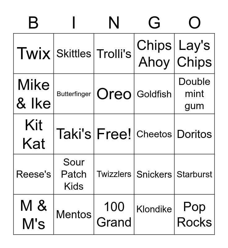 This bingo card has a free space and 24 words: Sour Patch Kids, Mentos, Oreo, M & M's, Lay's Chips, Twix, Mike & Ike, Skittles, Cheetos, Twizzlers, Goldfish, Kit Kat, Snickers, Starburst, Butterfinger, Klondike, Doritos, Trolli's, Double mint gum, Taki's, Pop Rocks, Reese's, Chips Ahoy and 100 Grand.