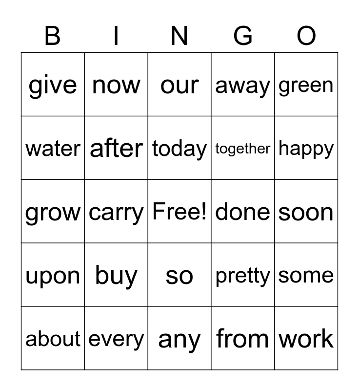 This bingo card has a free space and 29 words: about, animal, carry, eight, give, our, after, buy, done, every, soon, work, any, from, happy, once, so, upon, green, grow, pretty, should, together, water, away, now, some, today and way.