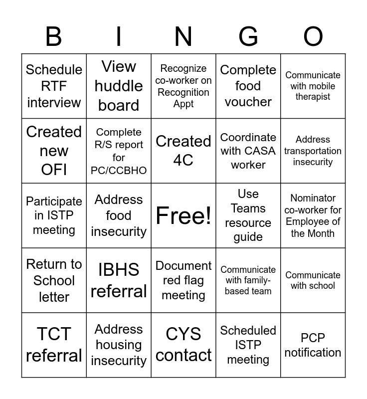 This bingo card has a free space and 27 words: Communicate with family-based team, Family-based referral, Coordinate with CASA worker, CYS contact, Created new OFI, Recognize co-worker on Recognition Appt, View huddle board, Return to School letter, Use Teams resource guide, Communicate with school, Participate in ISTP meeting, Complete food voucher, TCT referral, Address housing insecurity, Address transportation insecurity, DHP referral, Complete R/S report for PC/CCBHO, Created 4C, IBHS referral, Schedule RTF interview, Nominator co-worker for Employee of the Month, Scheduled ISTP meeting, Address food insecurity, PCP notification, Document red flag meeting, Communicate with mobile therapist and RTF referral.