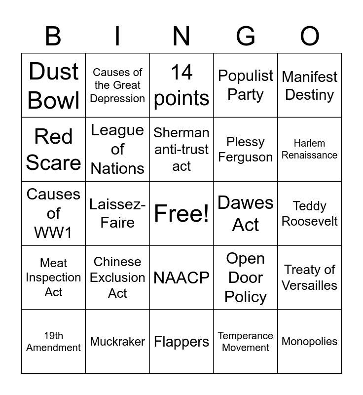 This bingo card has a free space and 24 words: Chinese Exclusion Act, Muckraker, Sherman anti-trust act, 19th Amendment, Manifest Destiny, Dust Bowl, Red Scare, Causes of the Great Depression, Dawes Act, NAACP, Plessy Ferguson, Causes of WW1, Open Door Policy, Treaty of Versailles, League of Nations, Temperance Movement, Teddy Roosevelt, 14 points, Harlem Renaissance, Laissez-Faire, Monopolies, Meat Inspection Act, Populist Party and Flappers.