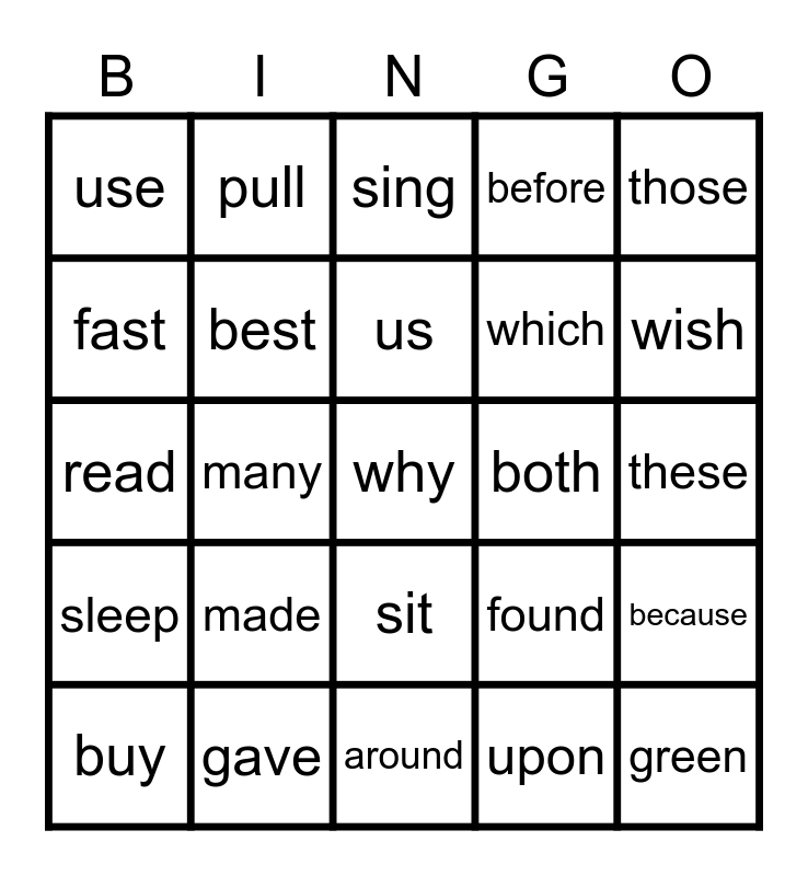 This bingo card has a free space and 24 words: made, gave, us, buy, those, use, fast, pull, both, sit, which, read, found, because, best, upon, these, sing, wish, many, green, sleep, before and around.