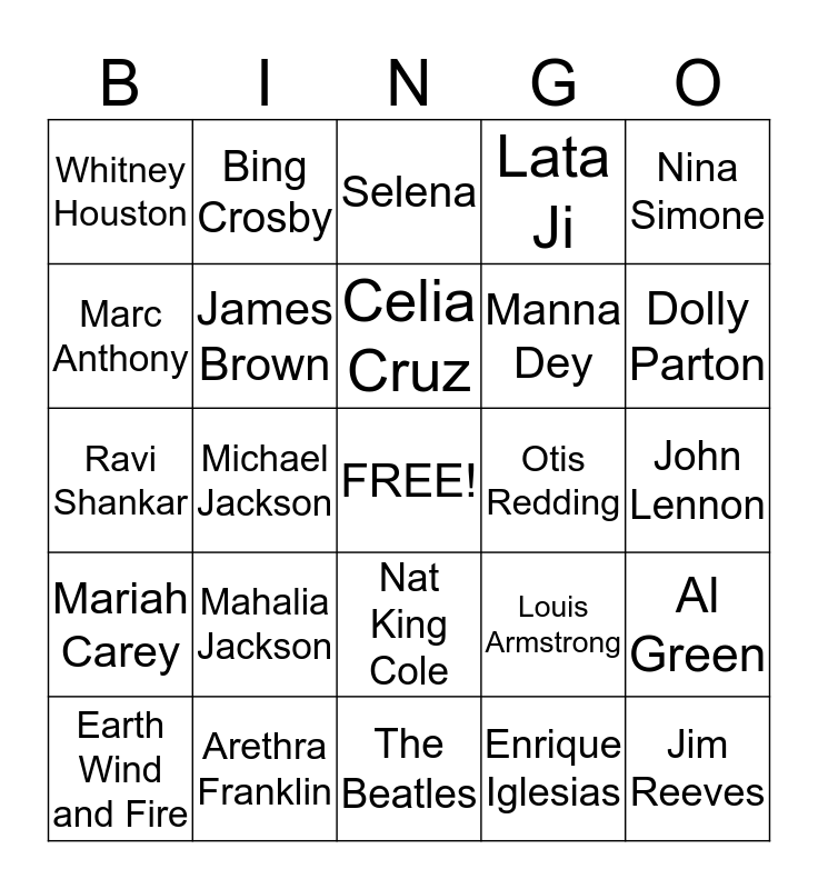 This bingo card has a free space and 26 words: Nat King Cole, Enrique Iglesias, Celia Cruz, Arethra Franklin, Nina Simone, Whitney Houston, Marc Anthony, Bing Crosby, John Lennon, Louis Armstrong, Manna Dey, Ravi Shankar, Al Green, Earth Wind and Fire, Michael Jackson, The Temptations, Lata Ji, Mariah Carey, Selena, Jim Reeves, Dolly Parton, The Beatles, Otis Redding, Mahalia Jackson, James Brown and Gladys Knight.