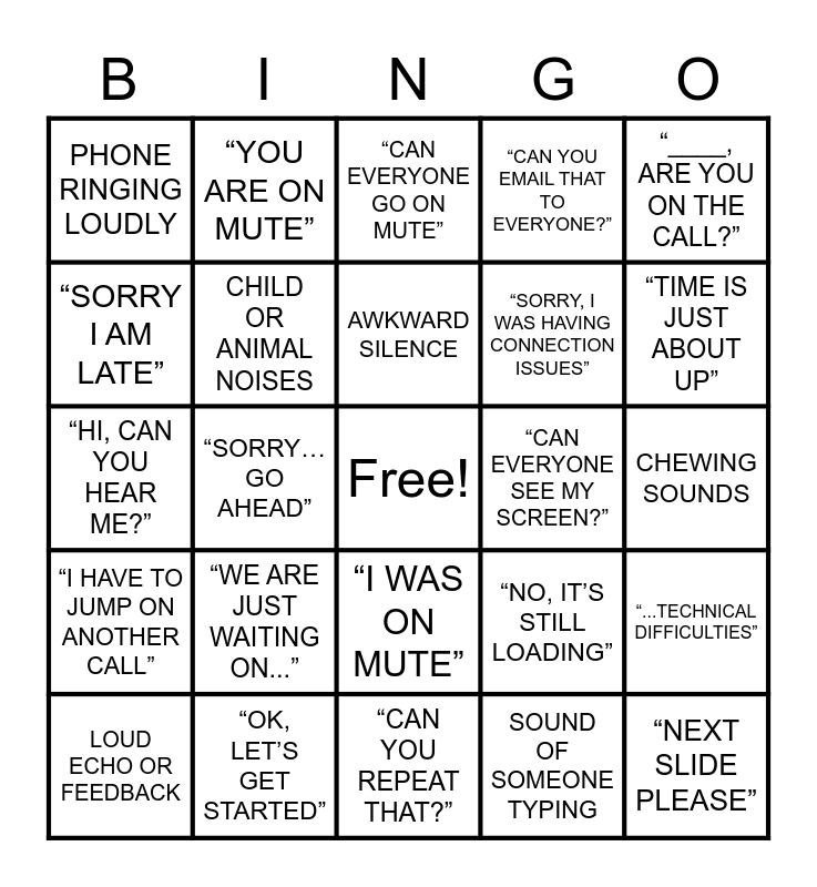 This bingo card has a free space and 24 words: “WE ARE JUST WAITING ON...”, “OK, LET’S GET STARTED”, AWKWARD SILENCE, LOUD ECHO OR FEEDBACK, “____, ARE YOU ON THE CALL?”, PHONE RINGING LOUDLY, “SORRY I AM LATE”, “YOU ARE ON MUTE”, “CAN EVERYONE SEE MY SCREEN?”, “I WAS ON MUTE”, “SORRY, I WAS HAVING CONNECTION ISSUES”, “HI, CAN YOU HEAR ME?”, “NO, IT’S STILL LOADING”, “...TECHNICAL DIFFICULTIES”, CHILD OR ANIMAL NOISES, SOUND OF SOMEONE TYPING, CHEWING SOUNDS, “CAN EVERYONE GO ON MUTE”, “TIME IS JUST ABOUT UP”, “SORRY… GO AHEAD”, “NEXT SLIDE PLEASE”, “I HAVE TO JUMP ON ANOTHER CALL”, “CAN YOU EMAIL THAT TO EVERYONE?” and “CAN YOU REPEAT THAT?”.