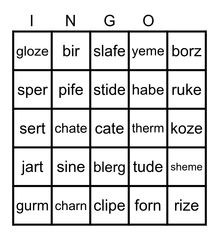 This bingo card has 25 words: sine, clipe, stide, gurm, borz, gloze, sper, bir, therm, blerg, habe, sert, tude, sheme, pife, rize, koze, slafe, ruke, chate, cate, charn, jart, yeme and forn.