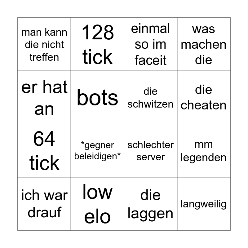 This bingo card has 16 words: low elo, mm legenden, einmal so im faceit, man kann die nicht treffen, 64 tick, 128 tick, schlechter server, die laggen, er hat an, bots, ich war drauf, was machen die, *gegner beleidigen*, die cheaten, die schwitzen and langweilig.