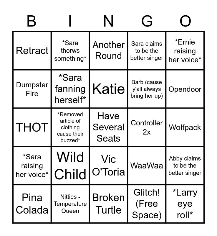 This bingo card has 30 words: Nitties - Temperature Queen, Burp, *Removed article of clothing cause their buzzed*, Audit Requests, Retract, Another Round, *Sara fanning herself*, Vic O'Toria, Controller 2x, Broken Turtle, Wolfpack, Have Several Seats, Glitch! (Free Space), *Larry eye roll*, Opendoor, Krystal Cussing, WaaWaa, *Sara raising her voice*, Wild Child, *Ernie raising her voice*, THOT, Larry Cussing, *Sara thorws something*, Barb (cause y'all always bring her up), Dumpster Fire, Sara claims to be the better singer, Abby claims to be the better singer, Pina Colada, Katie and Mateo Cussing.
