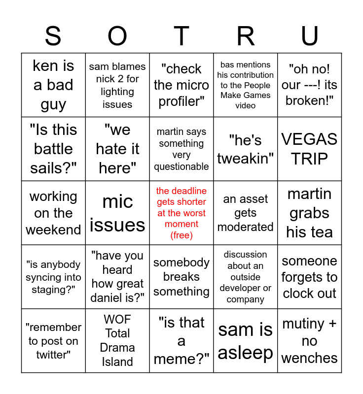 This bingo card has 1 images, a free space and 101 words: "aint no way", same question 3x in a row in Q&A, "oh no! our ---! its broken!", invoice is late, "lets go", unsolicited DMs from someone in the sonar community server, artists ask programmers for very niche tool or value, another channel gets taken away, "so true, so true", new 'art' on the office whiteboard, bas says something very questionable (free), "hart brocken", terrain materials are missing, someone mentions 'the list' for RDC, cloud system is mentioned, programmer says they want to die, "is anybody syncing into staging?", "say it aint so", someone forgets to post work on trello, "sea of thieves", "many people are saying this", weekly sync gets pushed back, "i have a complaint" about any art asset, make ocean more performant, del taco, VEGAS TRIP, bas mentions his contribution to the People Make Games video, "have you heard how great daniel is?", daniel quest, "is this game going to have historical ---?", sam blames nick 2 for lighting issues, "check the micro profiler", doordash driver is late/wrong delivery, liam has to make another boat, animation issue, somebody breaks something, roblox takes forever to give us vital documentation, roblox breaks something, working on the weekend, sam is asleep, "office gang", deepwoken comparison, "remember to post on twitter", (evil), layered clothing issues, "cranking 90's", "he's buggin", "he's tweakin", "certified tweaker mentality", anyone mentions Gasparilla, 6+ people in working channel, all muted, only artists working in programming channel, "Is this battle sails?", one nick answering questions meant for the other, among us dev team is mentioned, dolphin bug, getting your pay docked, someone roasts Riv in the community server, someone joins and doesn't read the FAQ in community server (free), mutiny + no wenches, sync gets rescheduled, "how's daniel task?", Code with Ken, roblox delivers incredibly unhelpful documentation or asset, car discussion happens during work, lighting issues, dave evades taxes yet again (free), martin grabs his tea, mic issues, WOF Total Drama Island, Ribeye, Nick 3, 6 figure salary, 4 months of development and no fall damage (free), climbing system, "we hate it here", Fargield, someone mentions the female avatar's physique, 'collaborative' 'developing', surprise roblox update or change to service, sam leaves to update sonaria, non-WOF join voice channel, an asset gets moderated, daniel makes another poor financial decision, martin says something very questionable, martin encounters a problem and forgets how to speak, complete silence after 'any questions?' during sync, the bloxy awards, "the cool nick", talking about any other game fund game, discussion about an outside developer or company, artist mentions that they hate UV unwrapping, AI issues, programmer says "look at this" and then it doesn't work, "is that a meme?", ken is a bad guy, "is the game out yet" / release date, someone forgets to clock out, someone posts a funny WOF image, impersonating nick 2 / nick 2 impression and jen & fabio passing files.