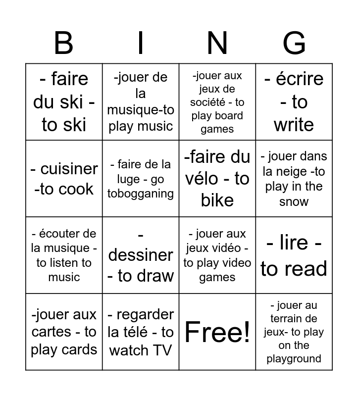 This bingo card has 17 words: Free!, -jouer aux cartes - to play cards, -jouer aux jeux de société - to play board games, - faire du ski - to ski, - dessiner - to draw, - écrire - to write, - lire - to read, -faire du vélo - to bike, - jouer dans la neige -to play in the snow, - faire de la luge - go tobogganing, - regarder la télé - to watch TV, - jouer aux jeux vidéo - to play video games, - cuisiner -to cook, -jouer de la musique-to play music, - écouter de la musique - to listen to music, - jouer au basketball - to play basketball and - jouer au terrain de jeux- to play on the playground.