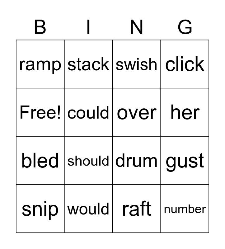 This bingo card has 16 words: would, gust, swish, ramp, bled, stack, drum, raft, Free!, could, snip, click, should, her, over and number.