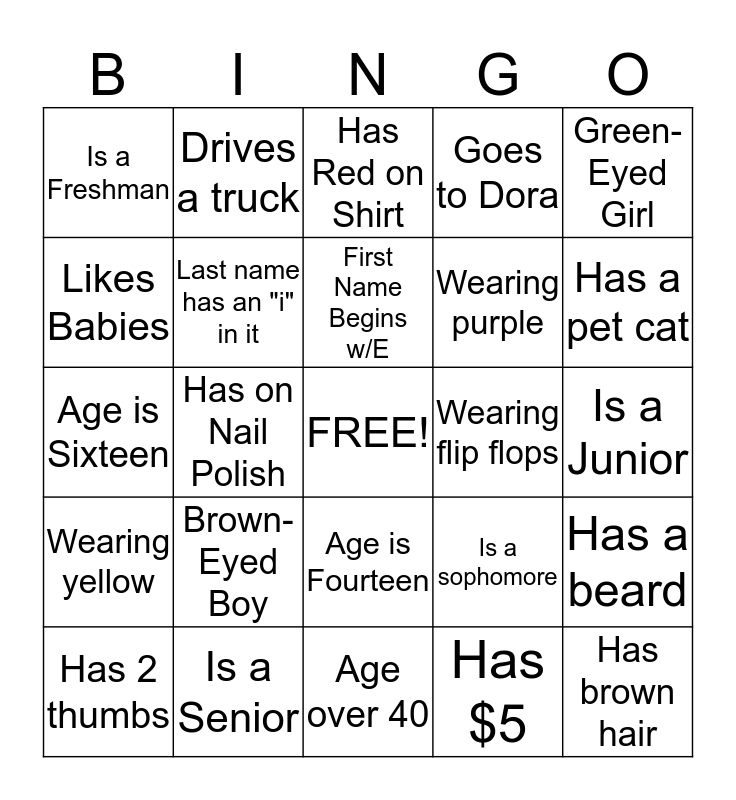 This bingo card has a free space and 24 words: Brown-Eyed Boy, Is a Senior, First Name Begins w/E, Has 2 thumbs, Green-Eyed Girl, Is a Freshman, Likes Babies, Drives a truck, Wearing flip flops, Age is Fourteen, Wearing purple, Age is Sixteen, Is a sophomore, Has a beard, Last name has an "i" in it, Has $5, Is a Junior, Has Red on Shirt, Has a pet cat, Has on Nail Polish, Has brown hair, Wearing yellow, Goes to Dora and Age over 40.
