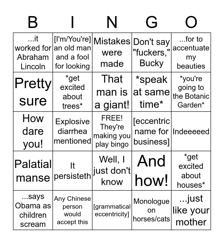 This bingo card has a free space and 24 words: It persisteth, Any Chinese person would accept this, That man is a giant!, ...says Obama as children scream, ...for to accentuate my beauties, ...it worked for Abraham Lincoln, Pretty sure, [I'm/You're] an old man and a fool for looking, [eccentric name for business], Well, I just don't know, *speak at same time*, How dare you!, And how!, *get excited about houses*, *get excited about trees*, Monologue on horses/cats, Indeeeeed, Mistakes were made, *you're going to the Botanic Garden*, Explosive diarrhea mentioned, ...just like your mother, Palatial manse, Don't say "fuckers," Bucky and [grammatical eccentricity].