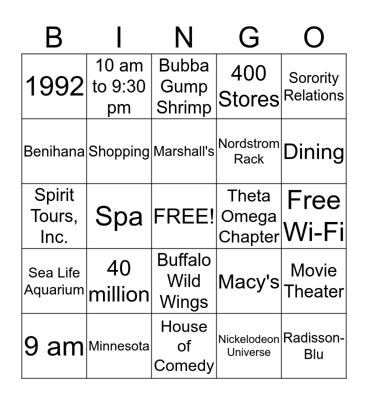 This bingo card has a free space and 24 words: 40 million, Minnesota, Marshall's, 9 am, Sorority Relations, 1992, Benihana, 10 am to 9:30 pm, Theta Omega Chapter, Buffalo Wild Wings, Nordstrom Rack, Spirit Tours, Inc., Macy's, Movie Theater, Shopping, Nickelodeon Universe, Free Wi-Fi, Bubba Gump Shrimp, Dining, Spa, Radisson-Blu, Sea Life Aquarium, 400 Stores and House of Comedy.